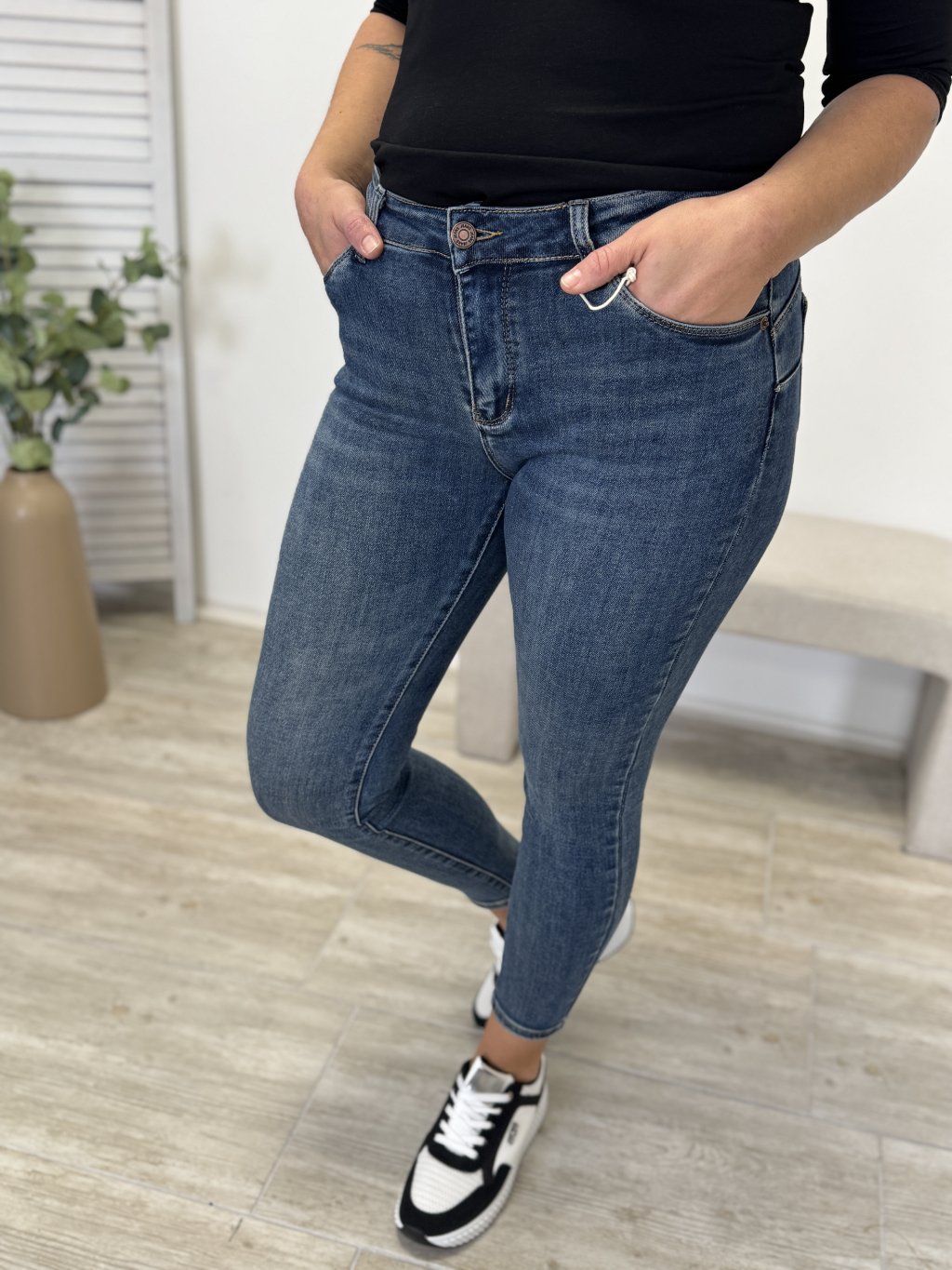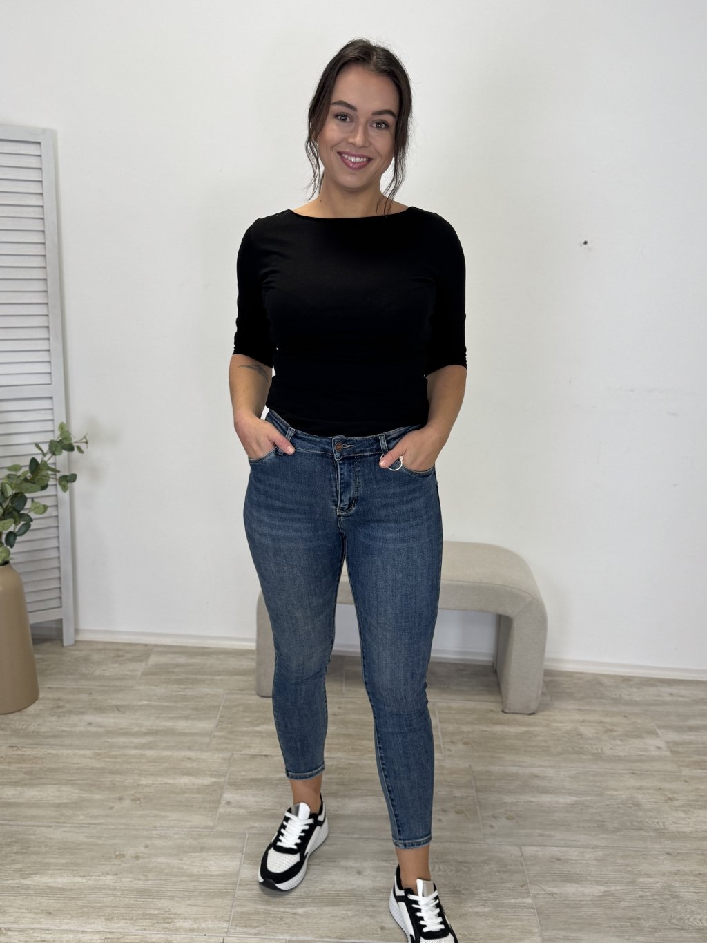 Úzké džíny oblíbené značky M.Sara jsou pohodlné, elastické a krásně kopírují postavu. Push-up kapsy vzadu tvarují siluetu a dodávají hezký vzhled. Modrá lehce vyšmelcovaná barva působí zajímavě.