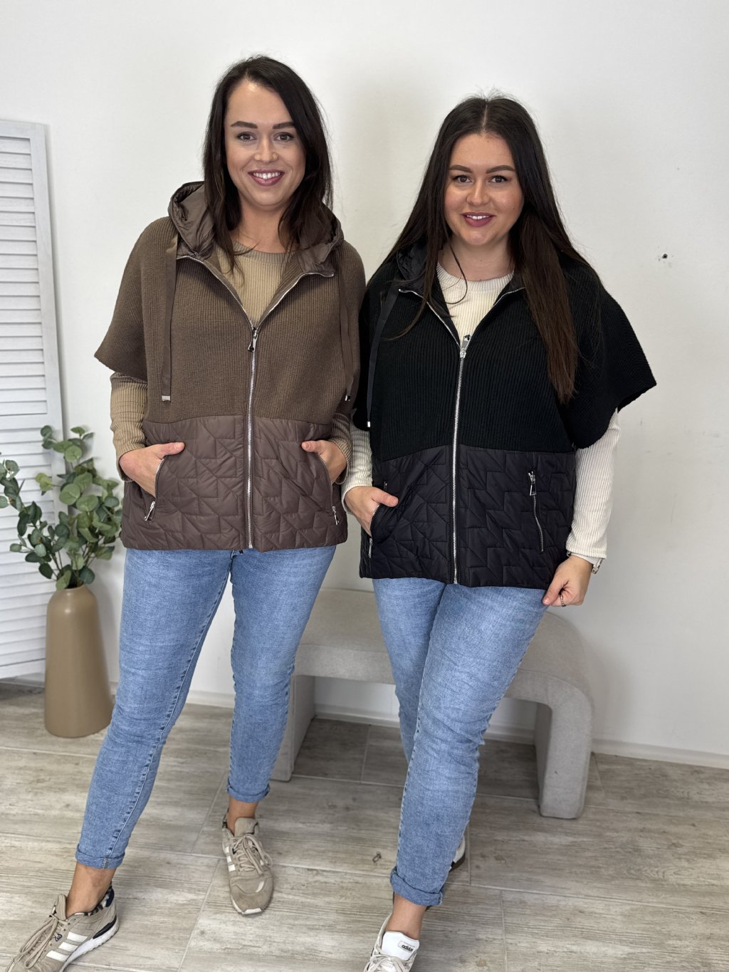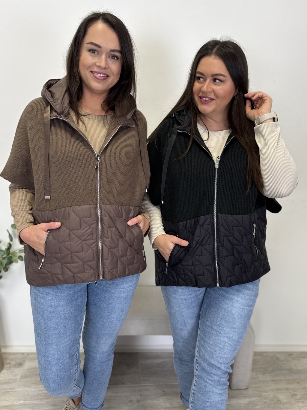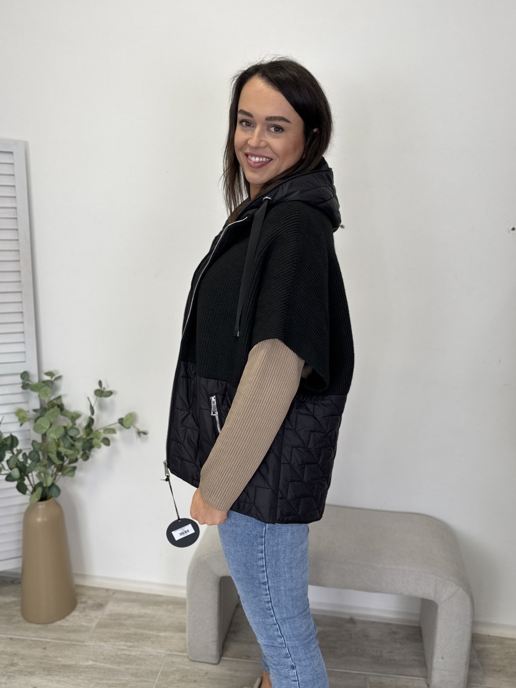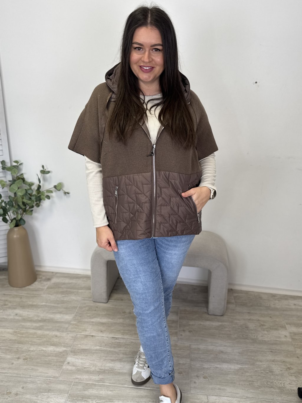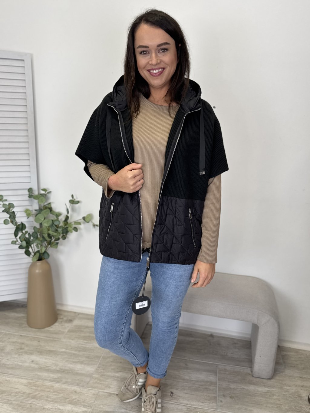 Zajímavá svetrová vesta kombinovaná s bundovým materiálem. Kapuce a spodní díl vesty z bundového materiálu dodávají styl a strukturu. Kapsy na zip a pohodlný střih zajišťují praktičnost i komfort. Elegantno-sportovní kousek, který hezky padne a oživí outfit.