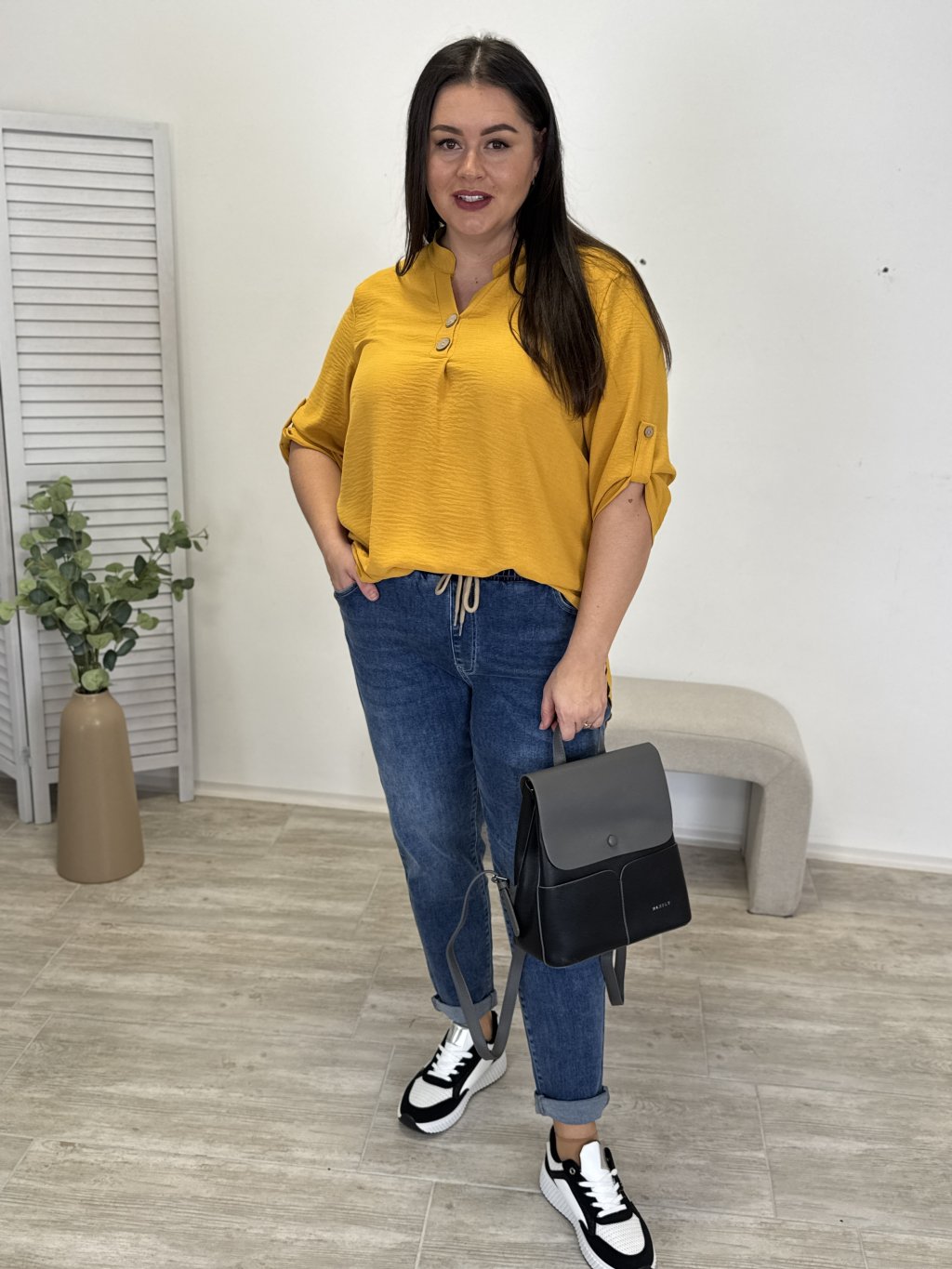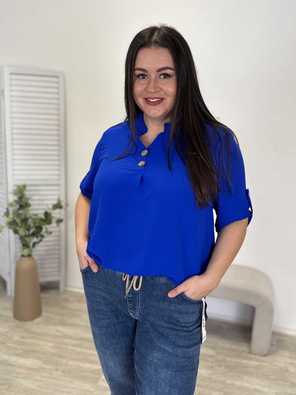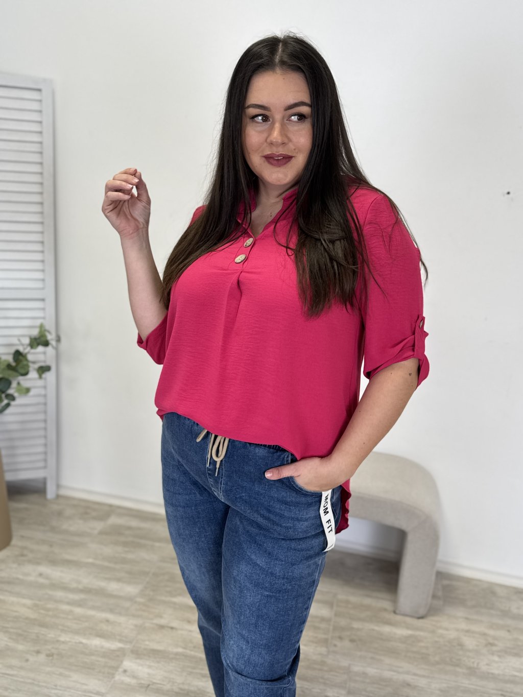 Halenka s lehce véčkovým výstřihem, který je doplněný o dva okrasné dřevěné knoflíčky. Rukávy jsou stažené knoflíčkem, takže dobře drží tvar a nepřekáží. Velkou výhodou je nemačkavý materiál, díky kterému je halenka praktická na celodenní