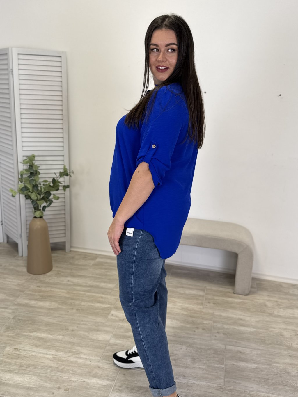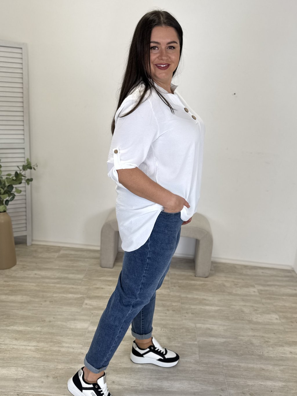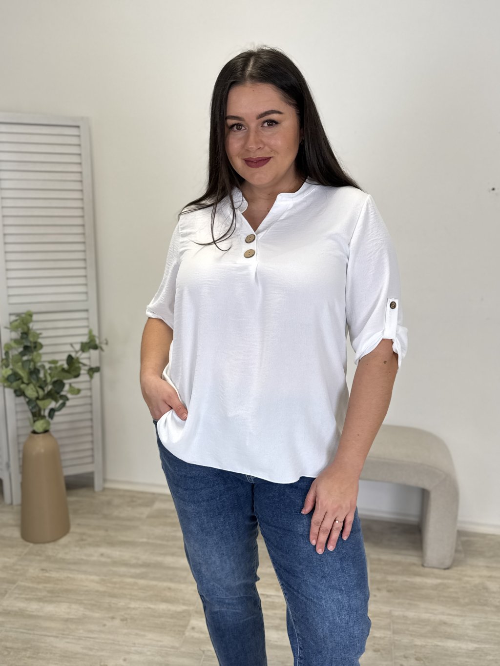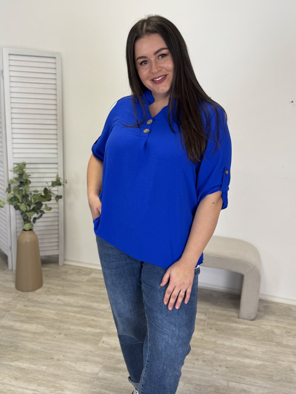Halenka s lehce véčkovým výstřihem, který je doplněný o dva okrasné dřevěné knoflíčky. Rukávy jsou stažené knoflíčkem, takže dobře drží tvar a nepřekáží. Velkou výhodou je nemačkavý materiál, díky kterému je halenka praktická na celodenní