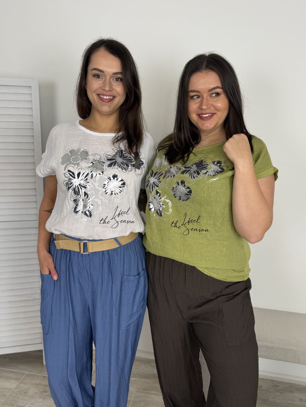 Volnější tričko s potiskem květů ve stříbrno-modré barvě. Krátký rukáv a kombinace pevného lnu vpředu a pružnější bavlny vzadu. Lehký a příjemný kousek, který si zamilujete na každý den.