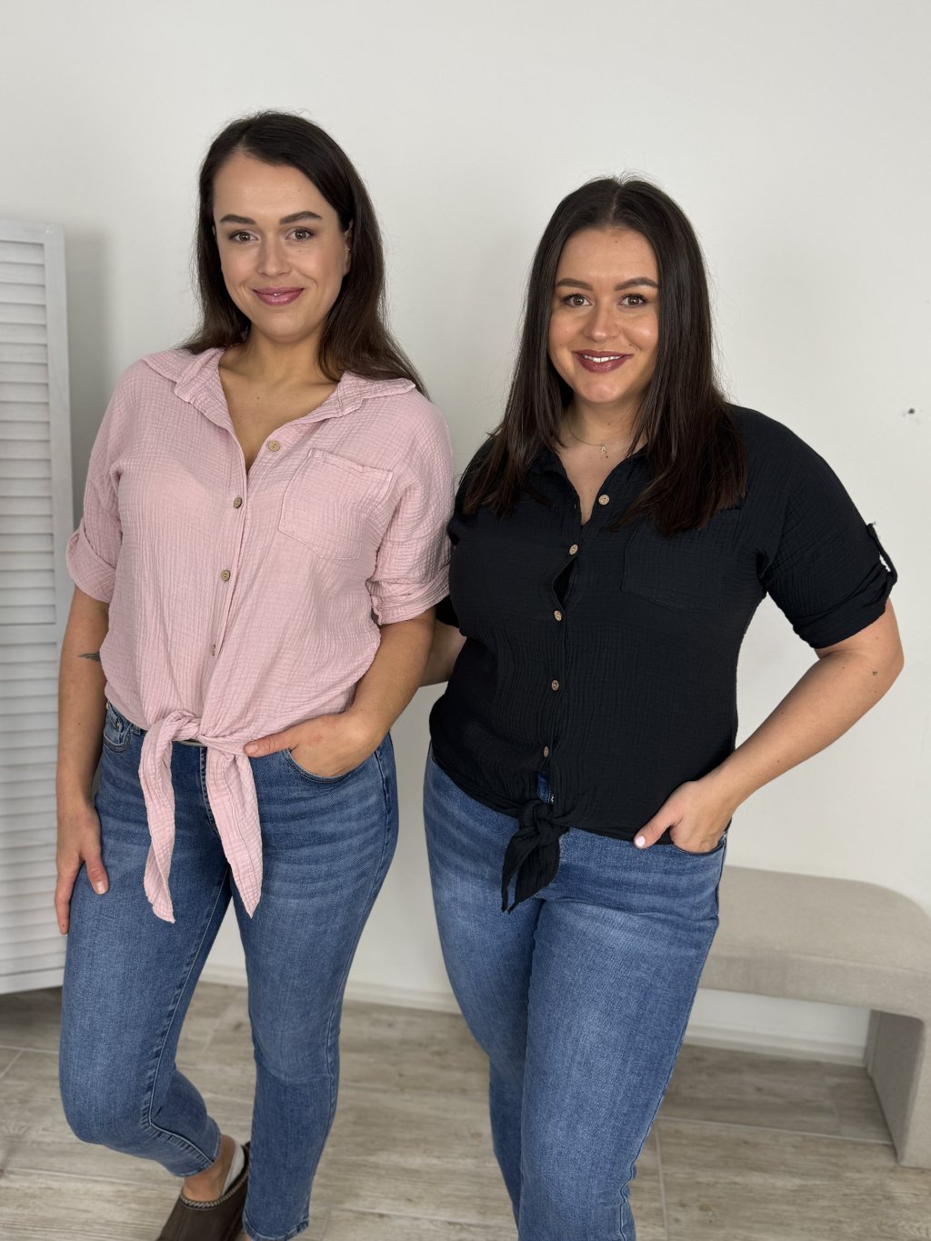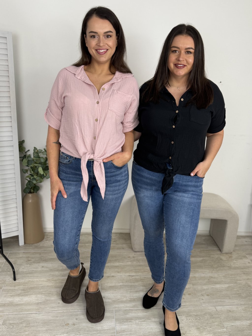 Lehká mušelínová košile s límečkem a zapínáním na knoflíčky. Má 3/4 rukávy s knoflíčkem, kapsičku a vázání dole, které dodává košili stylový detail. Vzdušný a pohodlný kousek, ideální na každý den.